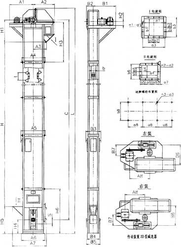 TH型斗提機(jī)外形見(jiàn)圖2,其尺寸見(jiàn)表7、驅(qū)動(dòng)裝置配套及相關(guān)尺寸見(jiàn)表9。