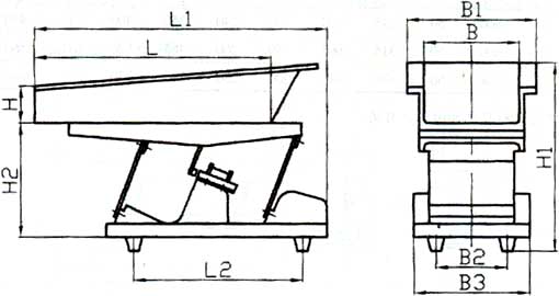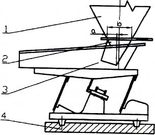 電磁振動給料機的振幅和給料量受料倉倉壓影響較大,設計料倉時應盡量減少倉壓,使溜咀后側板承受一定的倉壓,并設置斜溜沮及下料閘門。如圖,一般a=1/4b。溜咀四周應與給料槽留有一定的間隙,一般5~10mm,以免產(chǎn)生噪音及影響振動。